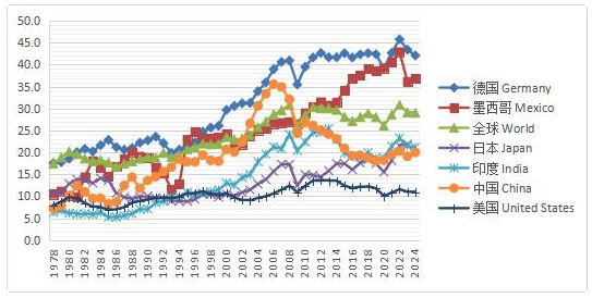疫情三年里,中国经济自身需求受到抑制,但生产供应链情况还可以,叠加西方财政刺激,经济复苏较快,2022年中国的出口占比上升至GDP的20.3%。中国出口占比在2023年略有下降,至19%,2024年略有上升,至20%。这个比率比美国的11%高很多,但是和其他大的经济体(如日本、印度)差不多,比墨西哥(37%)等相对较小的经济体低很多,也远低于世界中位数水平(约38%)。